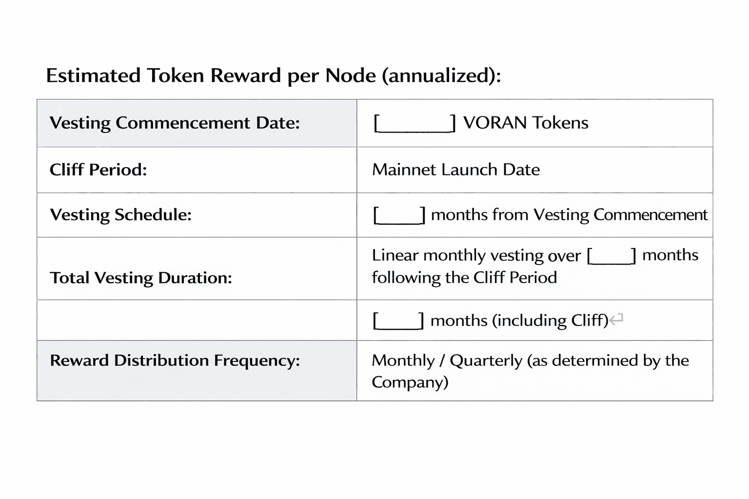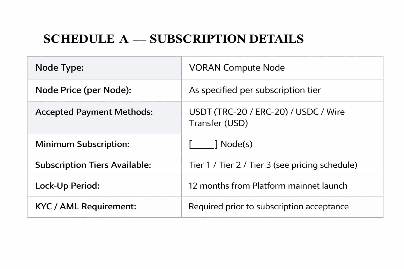 This document is provided for informational and reference purposes only and does not constitute a binding offer or solicitation. Qualified subscribers will receive the binding subscription agreement upon approval of their participation in the VORAN Node Private Sale.